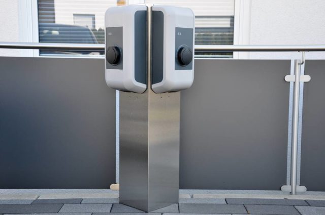 An dieser Ladesäule befinden sich zwei Typ 2 Stecker an denen entweder ein Fahrzeug mit 22kW oder zwei Fahrzeuge mit 11kW gleichzeitig geladen werden können. Generell kann man die Konfiguration der Ladesäule an die Bedürfnisse des Kunden anpassen.